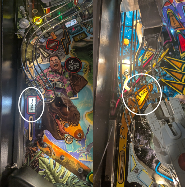 The other common ball save is on one of the outlanes. Both Jurassic Park and Star Trek have a save on the left outlane. Jurassic Park calls it “Escape” and gives you one per game for free, but on Star Trek you have to light the “Kickback” by hitting a few targets. So if these lights are lit when you drain out that side, get ready for the ball to come back.