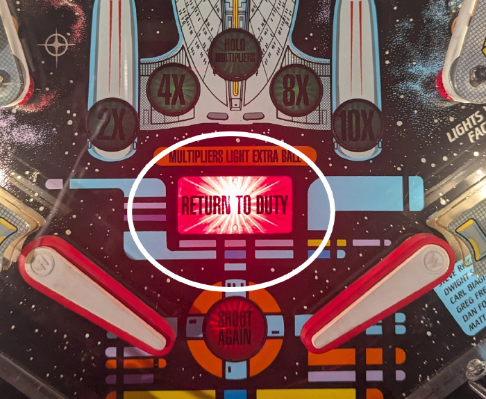 When first getting started on a ball, there’s usually a flashing light somewhere between the flippers. As long as that’s flashing, if you lose the ball it’ll come right back. On Star Trek it’s called “Return to Duty”, on D&D and Jurassic Park it’s just a yellow circle that says “Shoot Again”. FireBall II doesn’t have any ball save whatsoever.