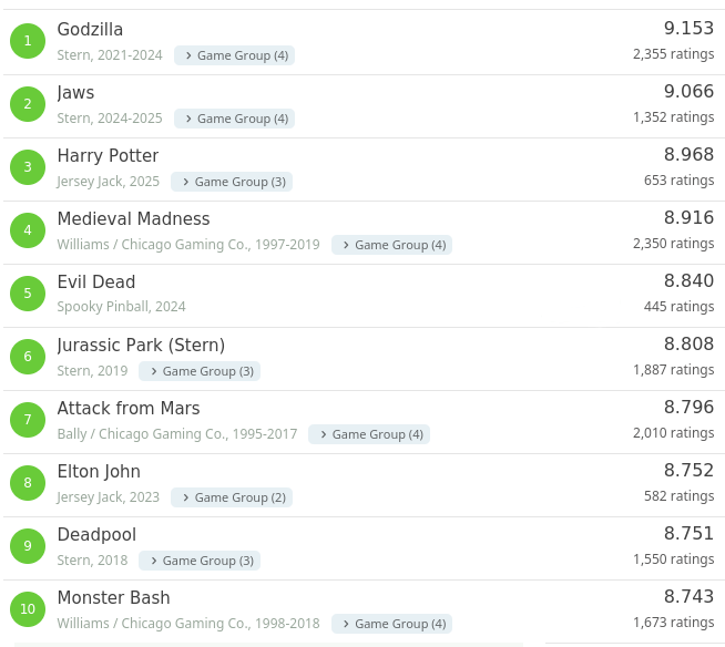 At some point after Williams stopped making pinball machines, Planetary Pinball acquired the rights to Medieval Madness. In 2015 Chicago Gaming Company licensed the right from Planetary Pinball to reproduce a limited number of copies of the game. With manufacturing help from Stern, Chicago Gaming Company created brand new machines that were nearly indistinguishable from the original from 1997. Since then, an additional run of remakes was made in 2019, again in 2025, and yet another run is planned for 2026.